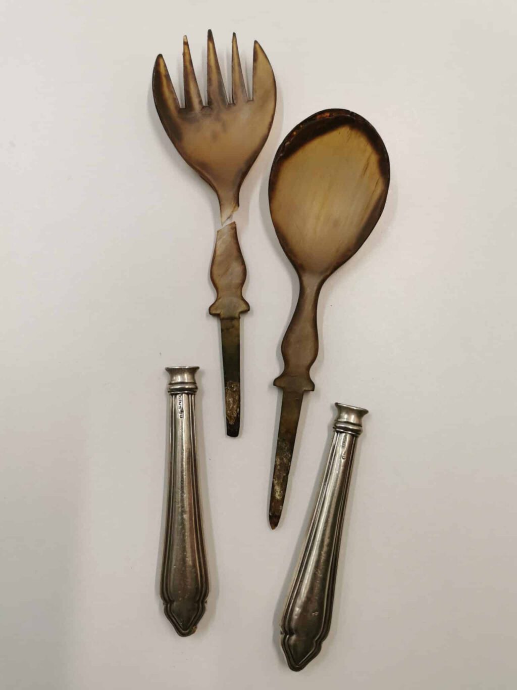 Wir reparieren Ihr antikes Salatbesteck aus Horn vollumfänglich.